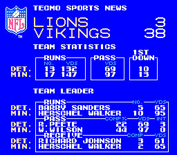 QB Bills completed 91% of his passes. The only incompletion occurred when James Lofton's protruding broken femur punctured the football. The referees were quick to delay the game, not because Lofton was badly injured, but because the host Patriots only owned one football. Final Score: Buffalo-35 New England-28 Cincinnati (5-6) vs. Los Angeles Raiders (5-6) I'm pretty cynical, or maybe it's just that I'm trying to put up an impossible front, but a late season game between two equally mediocre teams doesn't excite me. Of course I'm glad to see the Raiders being sent packing, but there are a lot of really intriguing Blades of Steel games that I could be simulating instead. Final Score: Cincinnati-28 Los Angeles-24 Denver (6-5) vs. Seattle (6-5) Now this game intrigues me a lot more, not only because of the inversed records, but because I have full faith in Denver's losing abilities which would further along my prediction of Seattle in the playoffs. John L. Williams had five catches for over 100 yards in this one which I find to be a rather interesting stat, although you may fairly yawn or even more fairly completely not be reading this page altogether. Final Score: Seattle-27 Denver-20