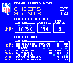 You're probably going to think this is bullshit, but realize there's not a lot in it for me to lie to a bunch of people reading play-by-play of a COM vs. COM Tecmo game. The Saints started with a thirty-yard run by Hilliard and I was just about to start typing, "The Saints come out with a big run by Dalton Hilliard, trying to prove to us all there's still plenty of time for a Steve Walsh interception." And on the very next play, Walsh and his suckiness obliged me. If I could predict the stock market like I can predict Tecmo occurrences, I'd be out in my fusion-powered golf cart right now. Chiefs Drive #8 The Chiefs basically just ran the clock out with some Okoye runs and incompletions. But in the middle of all of that, Steve DeBerg threw the most God-awful pass of the game. The only logical recipient that I could see was the first down stick. Closing Thought This game turned when the Chiefs started handing it off to the angry African instead of their terminally ill back. But my player of the game is going to go to Eric Martin, whose incredible catches kept the Saints from getting totally embarassed in this game. Tommy Barnhardt gets the runner-up award for having the stamina to punt the ball over ten thousand times in one game. ![]() ![]() |